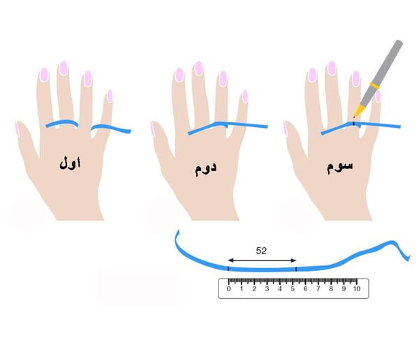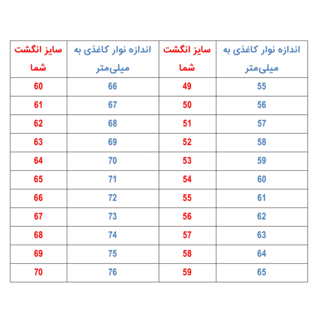 توجه داشته باشید نوار کاغذی را مطابق راهنما دور انگشت خود قرار دهید.برای انجام اینکار حتما موقعی که انگشت شما در حالت عادی هست دقت کنید. ورم انگشت ها در صبح و مواقعی که فشار خون داشته باشید یا در سرمای زیاد زیاد روی سایز انگشت شما تاثیرگذار خواهد بود.نوار کاغذی کاملا دور انگشت را گرفته باشد و فضای آزاد نداشته باشد مطمئن شوید که با آن اندازه انگشتتان راحت است و تنگ نیست.اگر بین دو سایز شک کردید بهتر است سایز بزرگتر (نیم سایز بزرگتر) را انتخاب کنید. معمولا سایز دست مردانه بین ۵۵ تا حدود ۶۵ استاندارد می باشد.سایز دست زنانه بین ۵۰ تا حدود ۶۰ استاندارد می باشد.اگر عدد اندازه گیری شده توسط شما ، کمتر یا بیشتر از ارقام جدول زیر باشد ، دست شما ظریف یا درشت تر از حد معمول است و برای راهنمایی بیشتر با ما در تماس باشید.در انتها سایز اندازه گرفته شده را طبق تصویر بالا با جدول زیر تطبیق دهید و سایز انگشت خود را بدانید